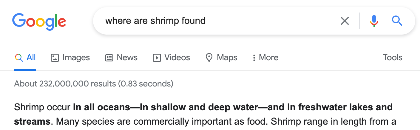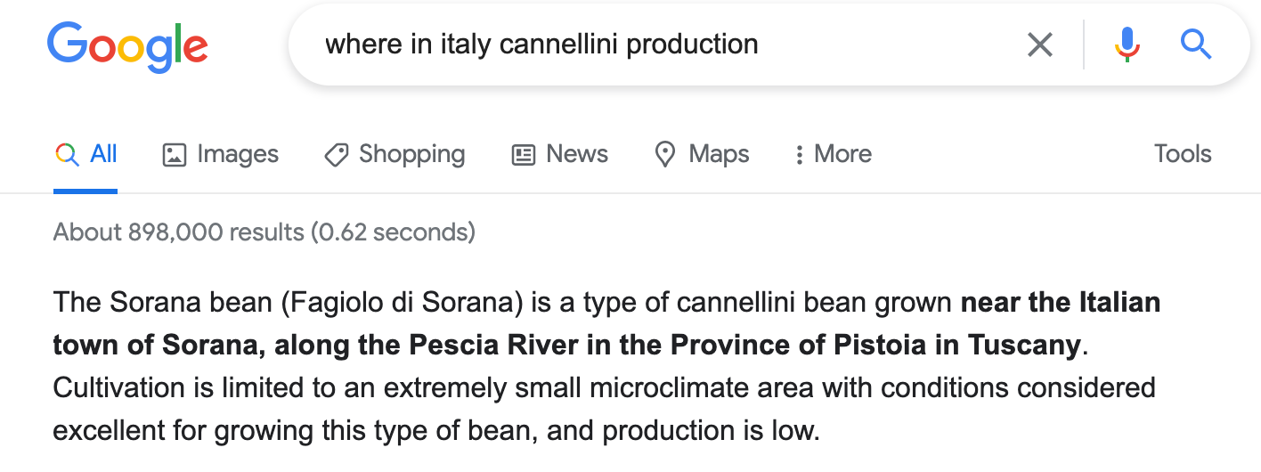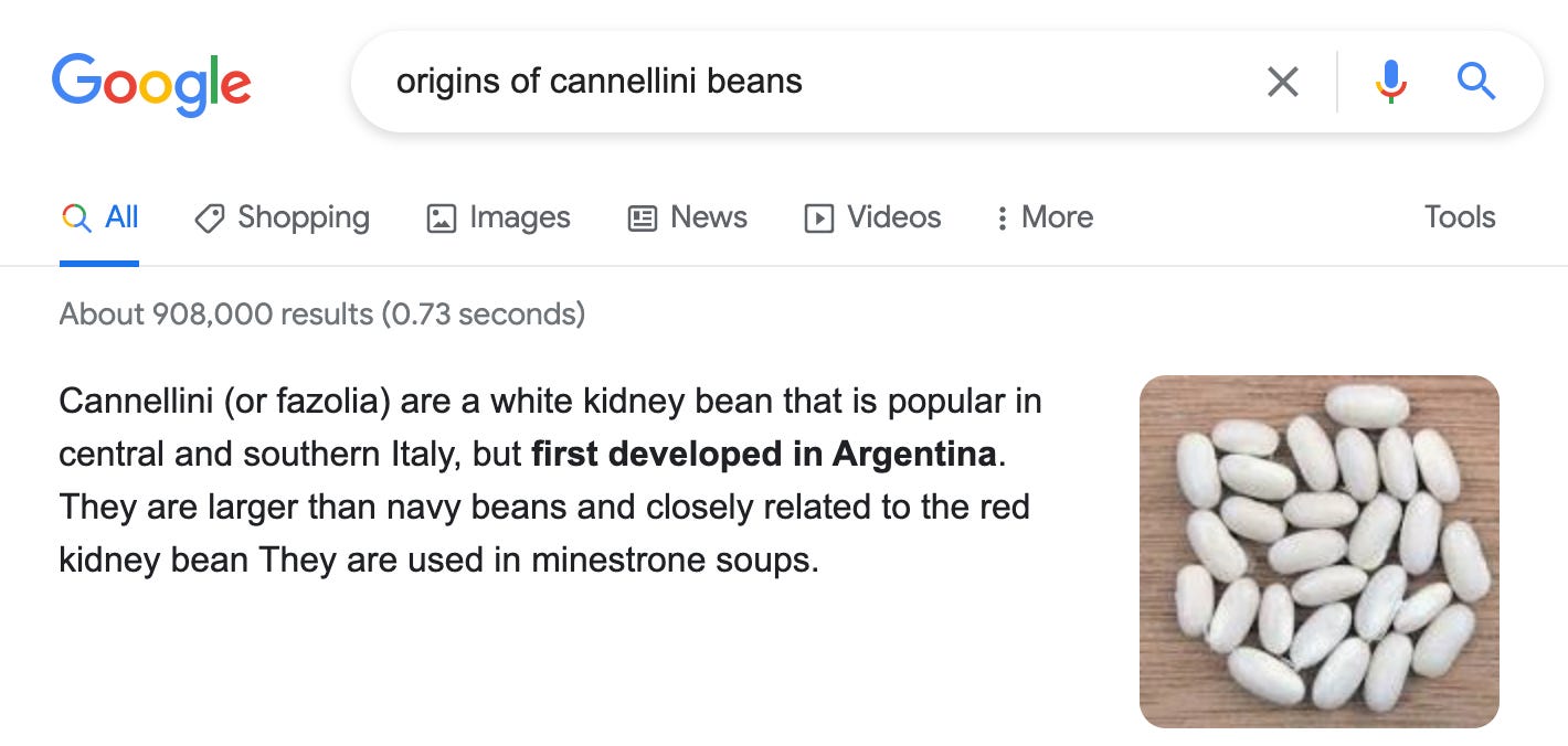 Concurrently searching for “italian shrimp and bean dish” yields a few vague confirmations: